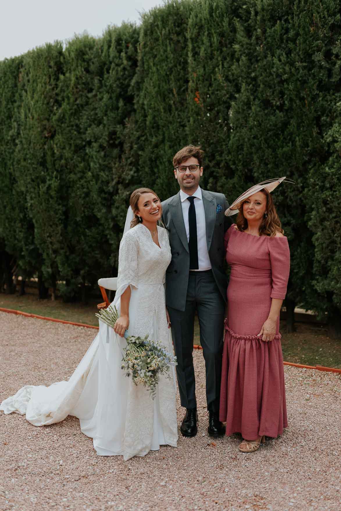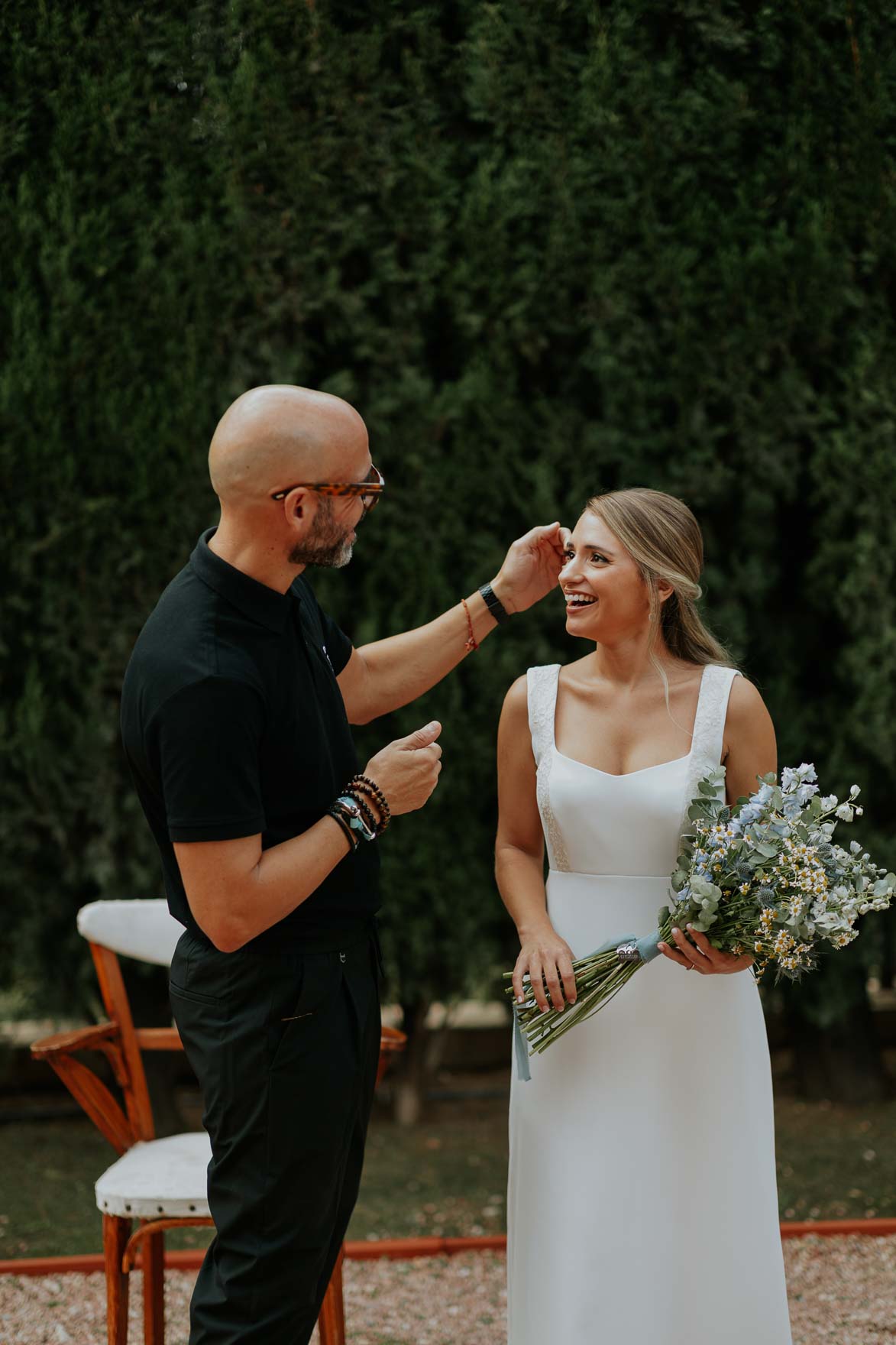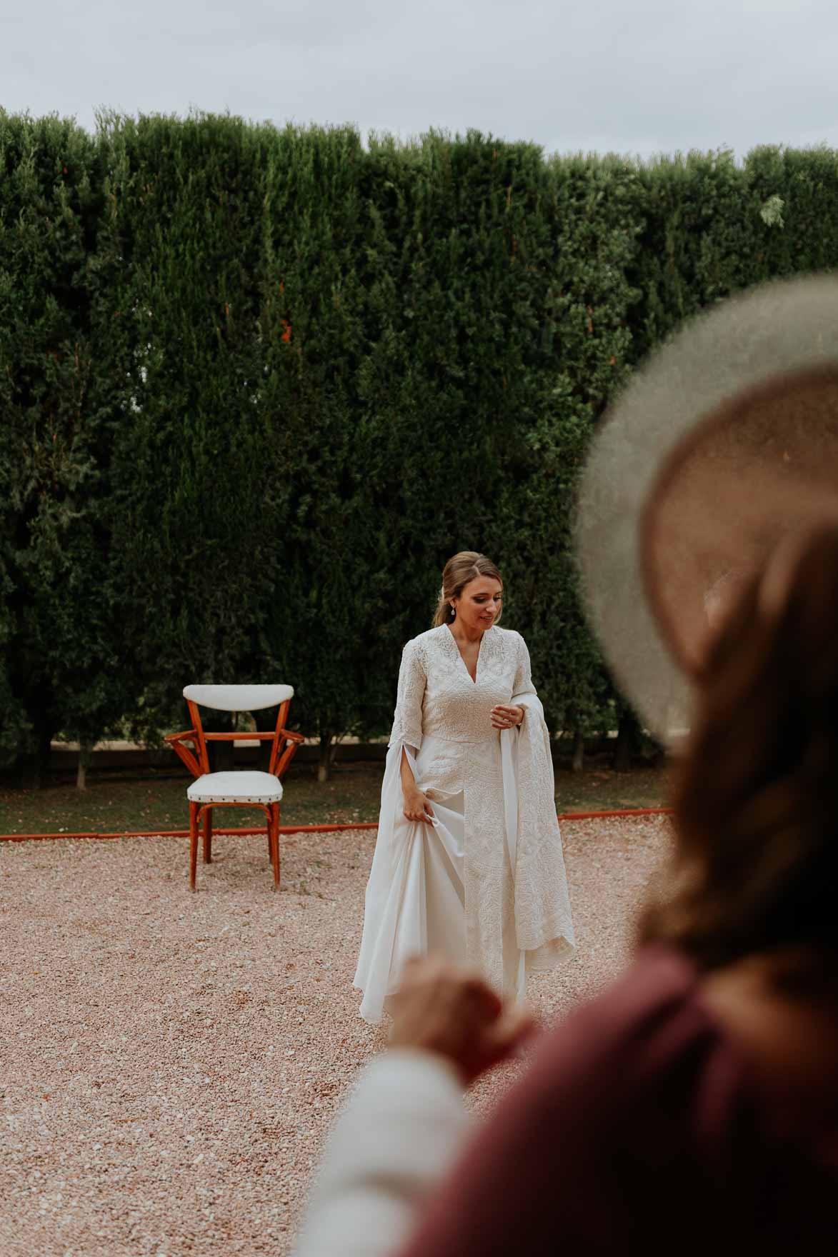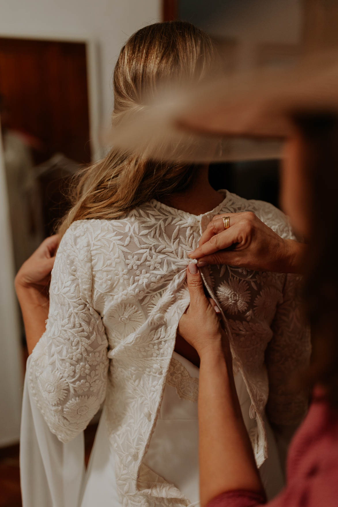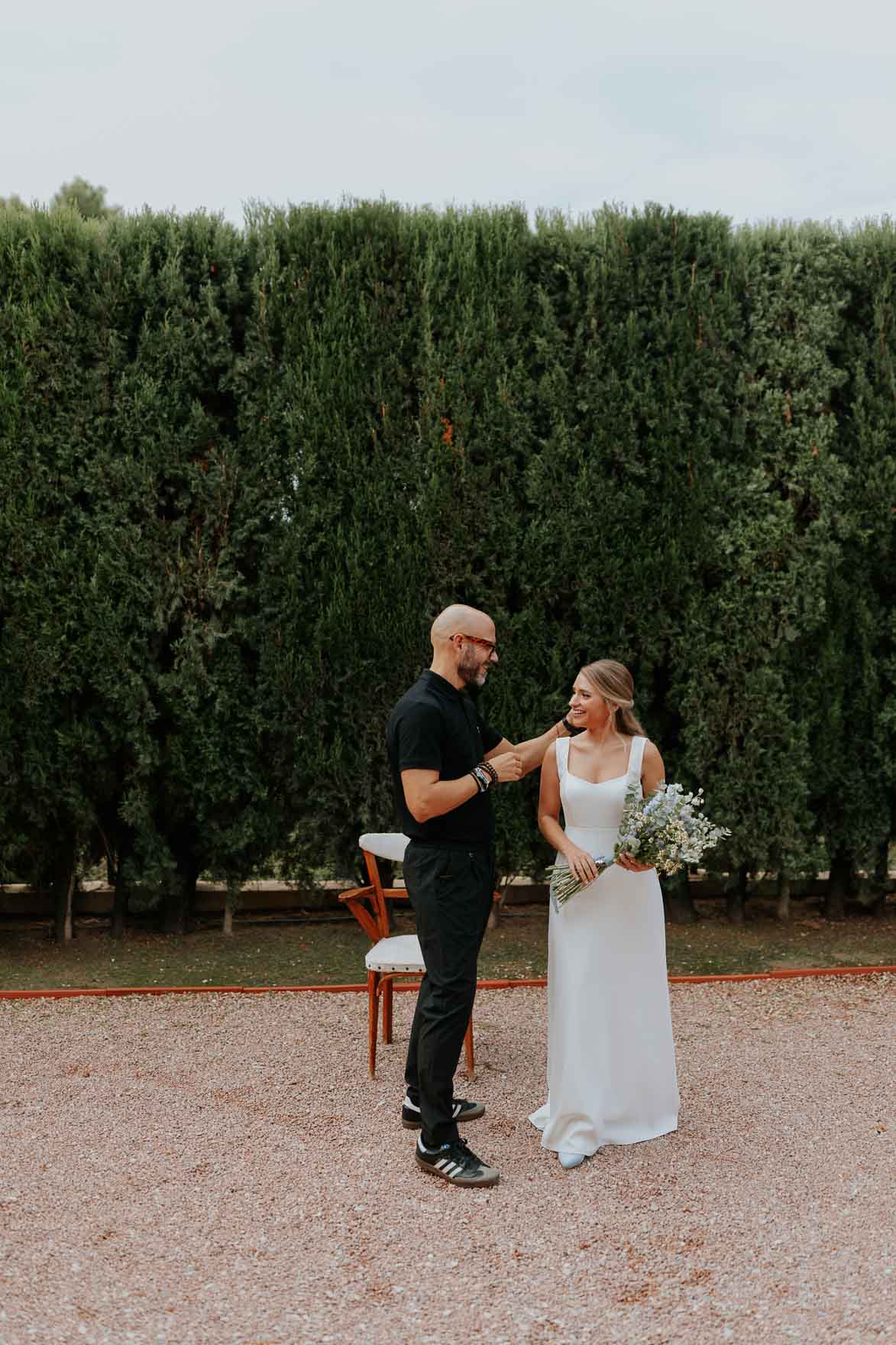 Celia lució un vestido base de crepé y encaje con falda de corte en “A”, sobre el que llevó un sobrevestido de gasa bordada con botones forrados y escote chimenea acabado en pico. Todo hecho a medida por Inma Aniorte, un diseño que reflejaba la delicadeza de la novia. El novio, con traje de Bund, completaba una pareja llena de estilo y complicidad.