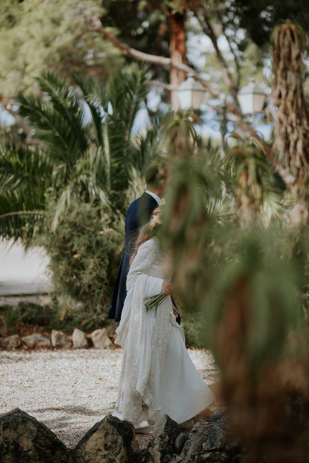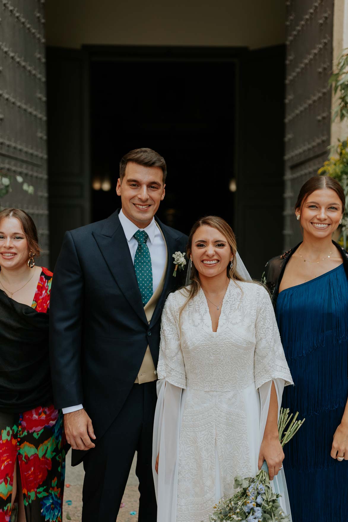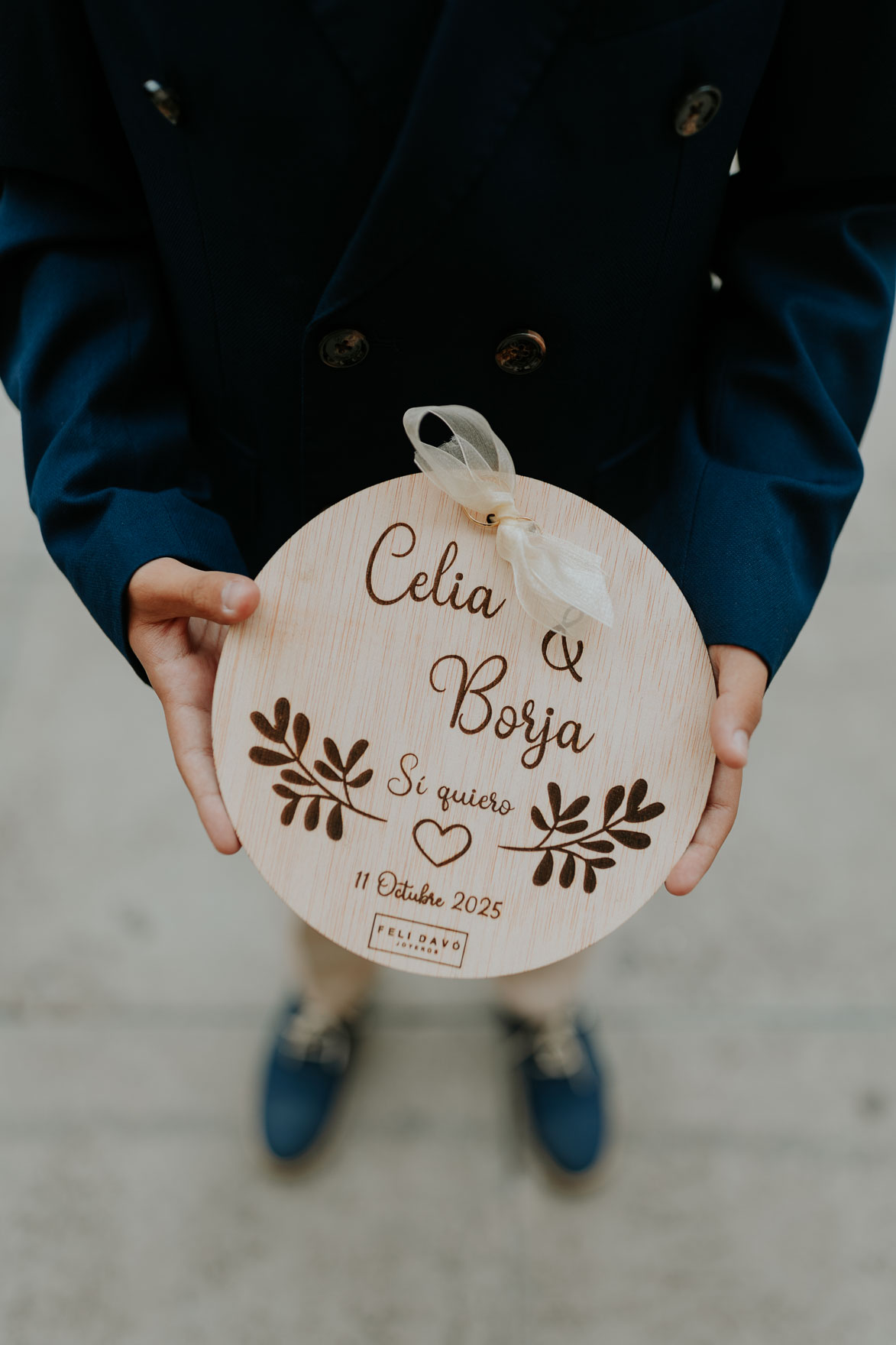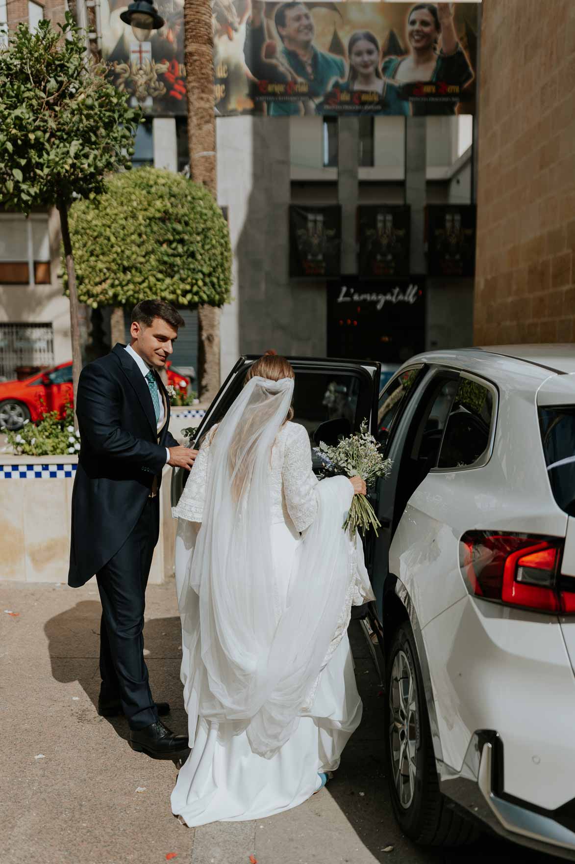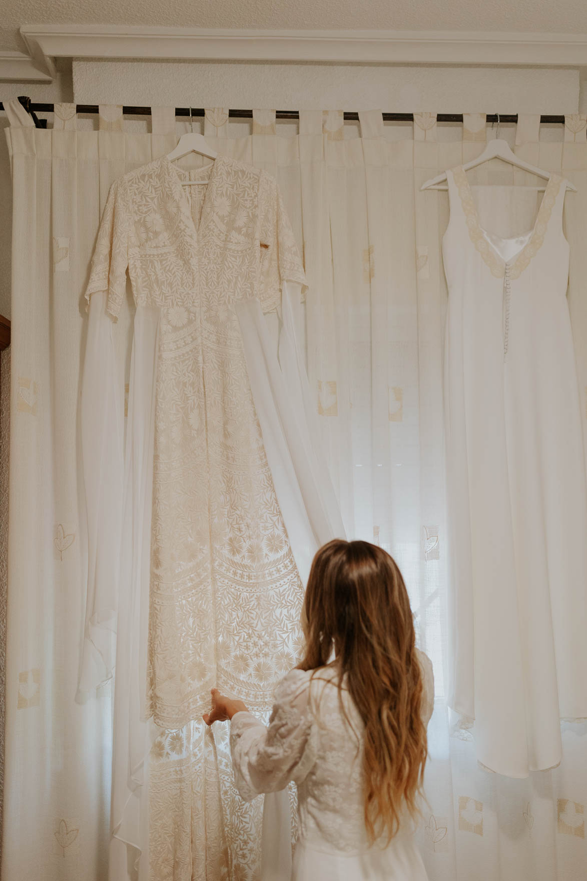 Celia lució un vestido base de crepé y encaje con falda de corte en “A”, sobre el que llevó un sobrevestido de gasa bordada con botones forrados y escote chimenea acabado en pico. Todo hecho a medida por Inma Aniorte, un diseño que reflejaba la delicadeza de la novia. El novio, con traje de Bund, completaba una pareja llena de estilo y complicidad.