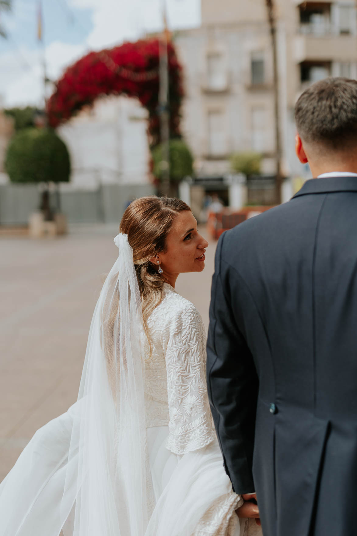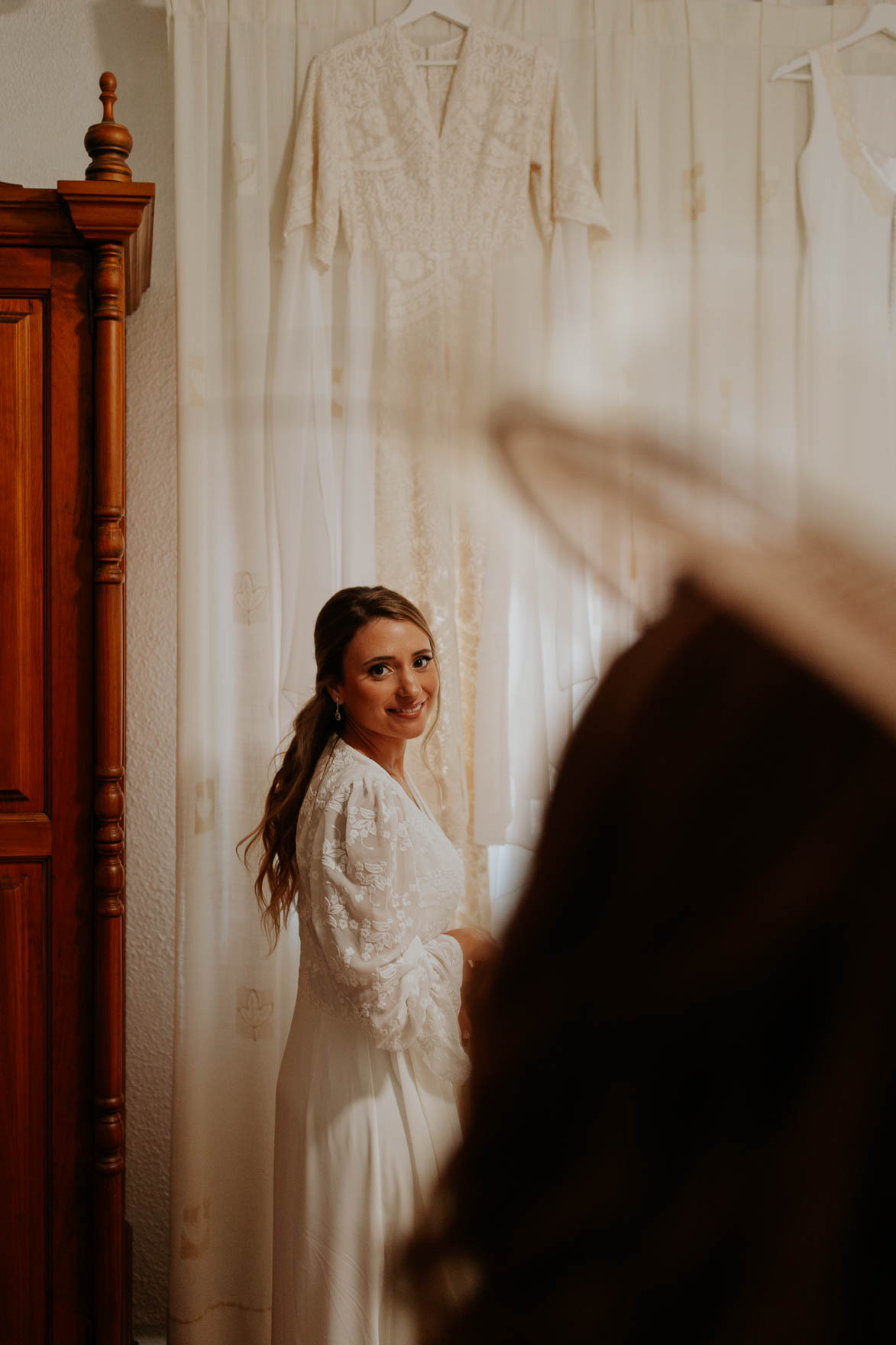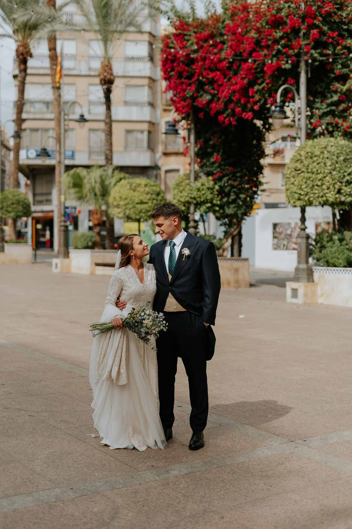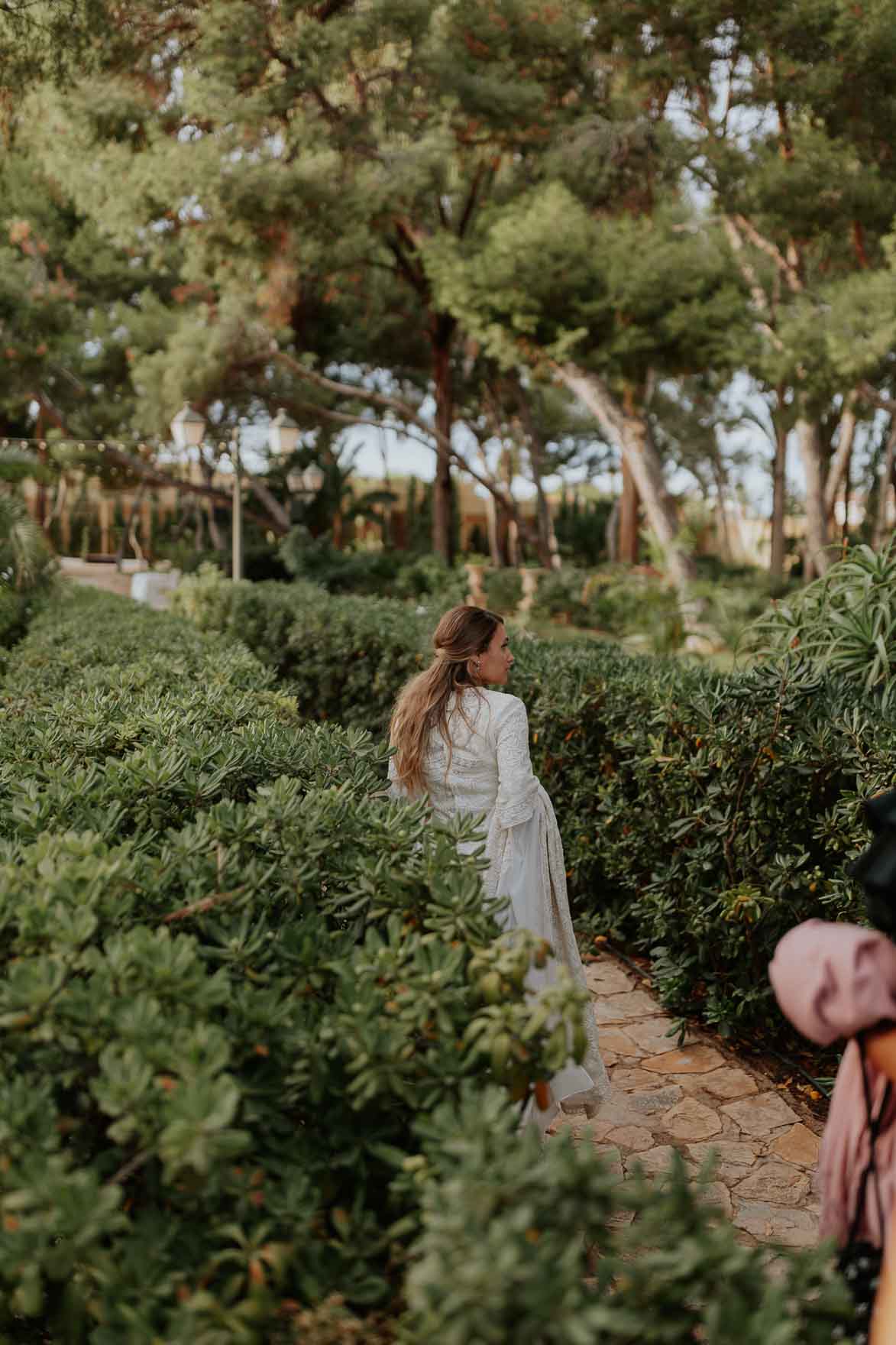 Celia lució un vestido base de crepé y encaje con falda de corte en “A”, sobre el que llevó un sobrevestido de gasa bordada con botones forrados y escote chimenea acabado en pico. Todo hecho a medida por Inma Aniorte, un diseño que reflejaba la delicadeza de la novia. El novio, con traje de Bund, completaba una pareja llena de estilo y complicidad.
