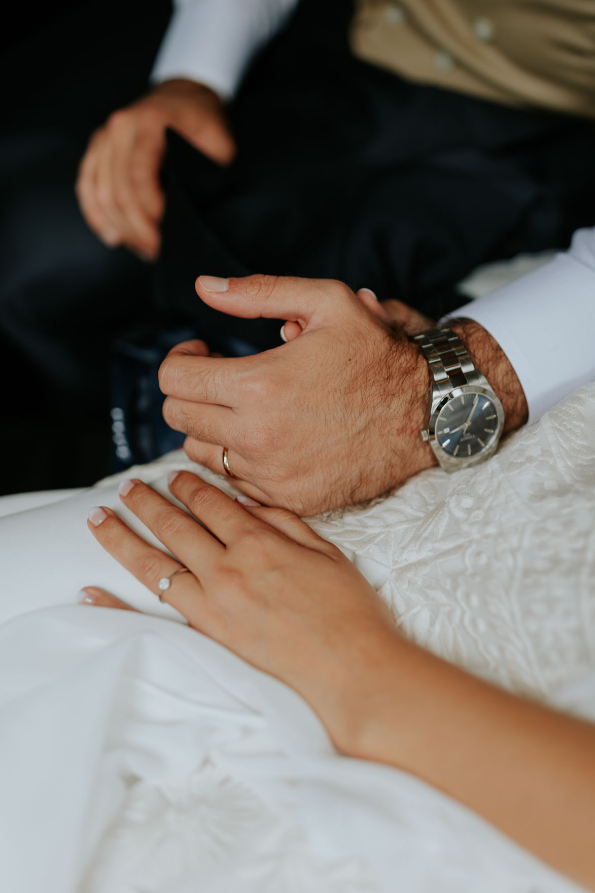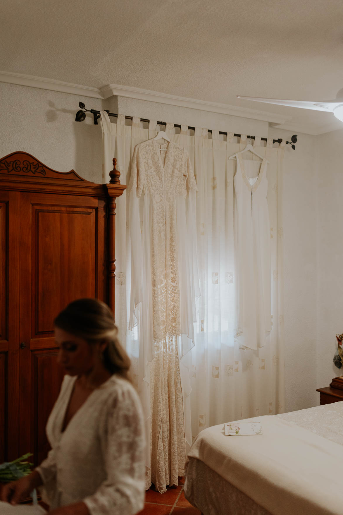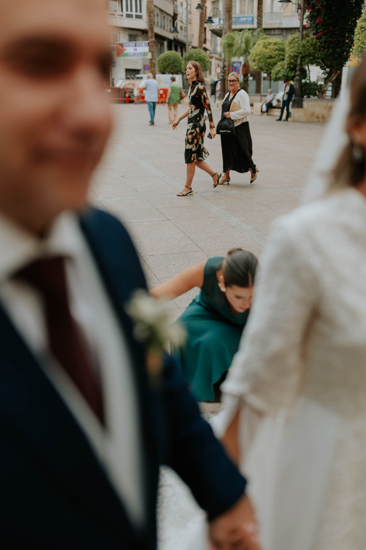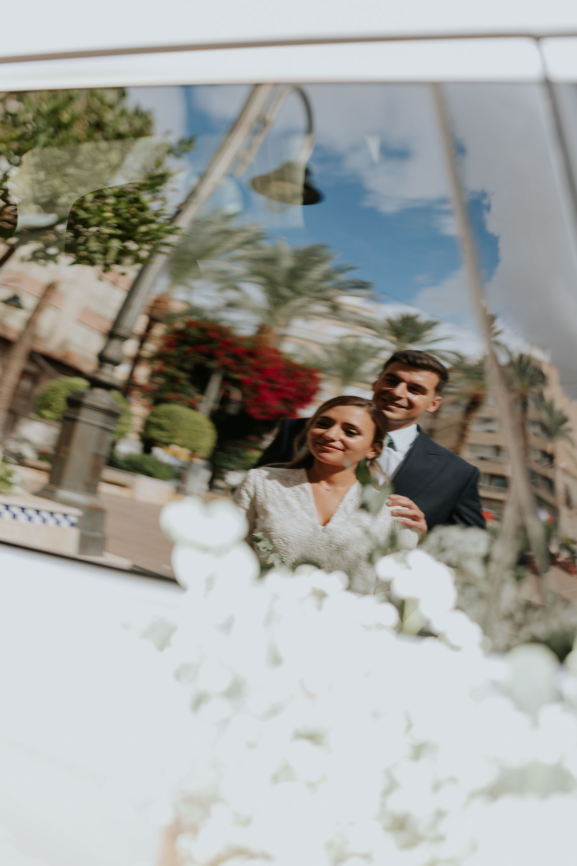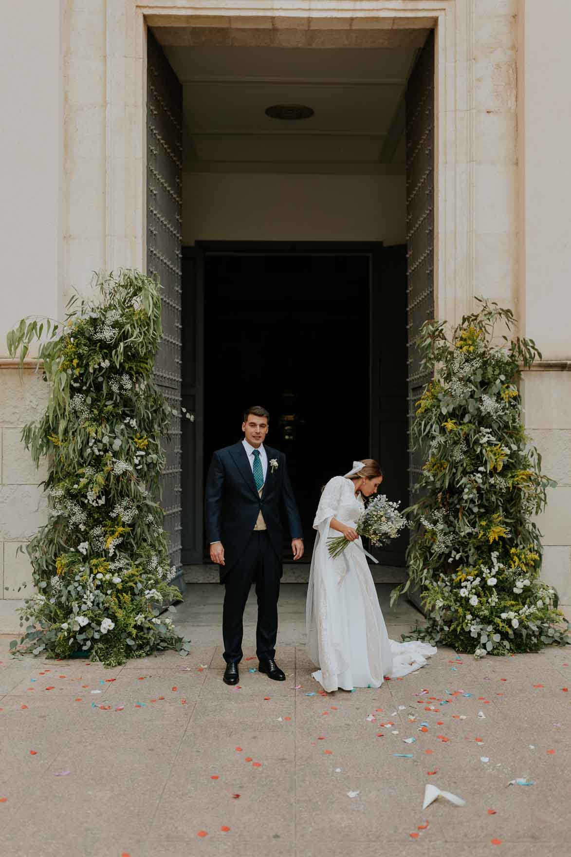 Celia lució un vestido base de crepé y encaje con falda de corte en “A”, sobre el que llevó un sobrevestido de gasa bordada con botones forrados y escote chimenea acabado en pico. Todo hecho a medida por Inma Aniorte, un diseño que reflejaba la delicadeza de la novia. El novio, con traje de Bund, completaba una pareja llena de estilo y complicidad.