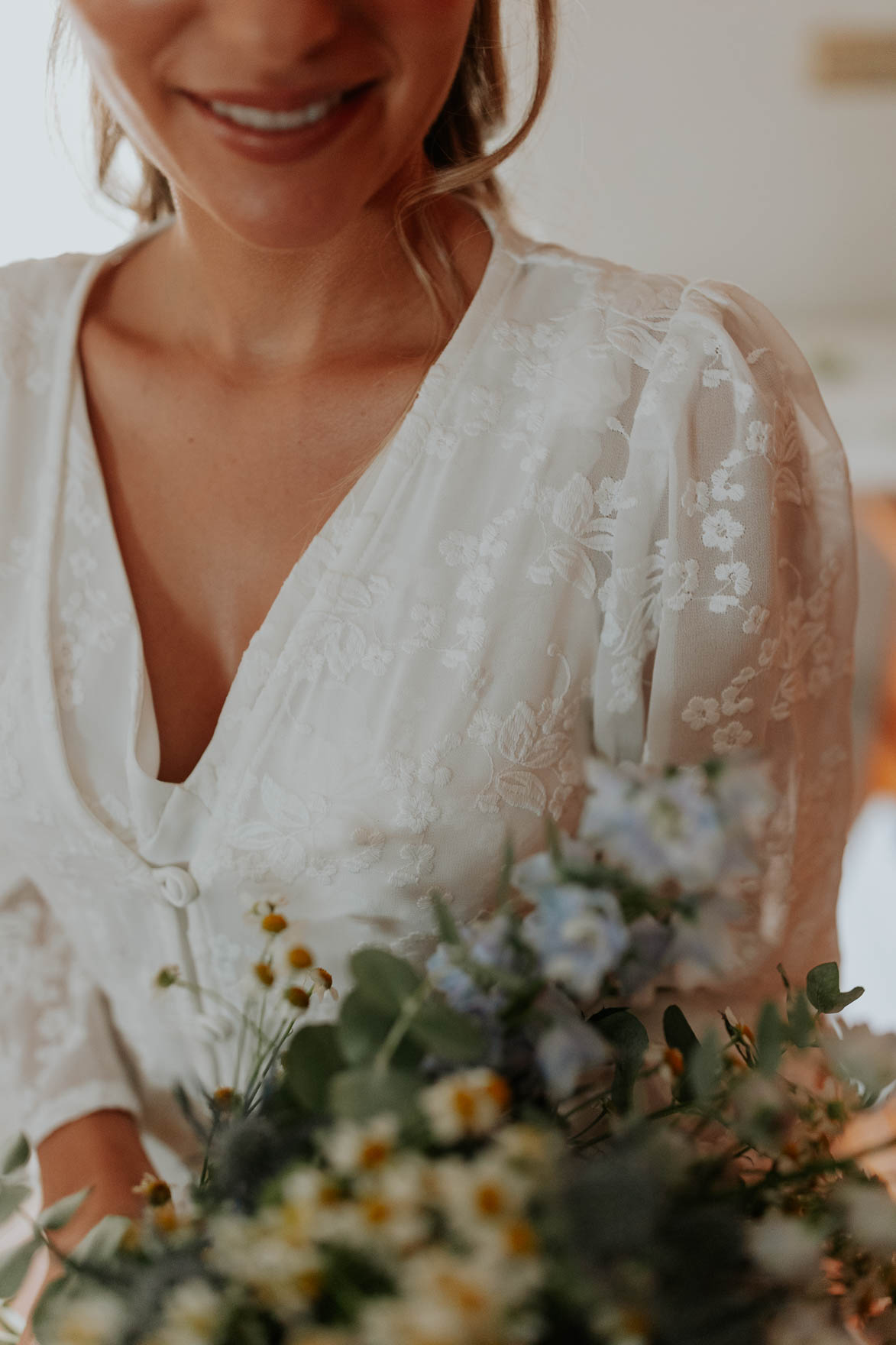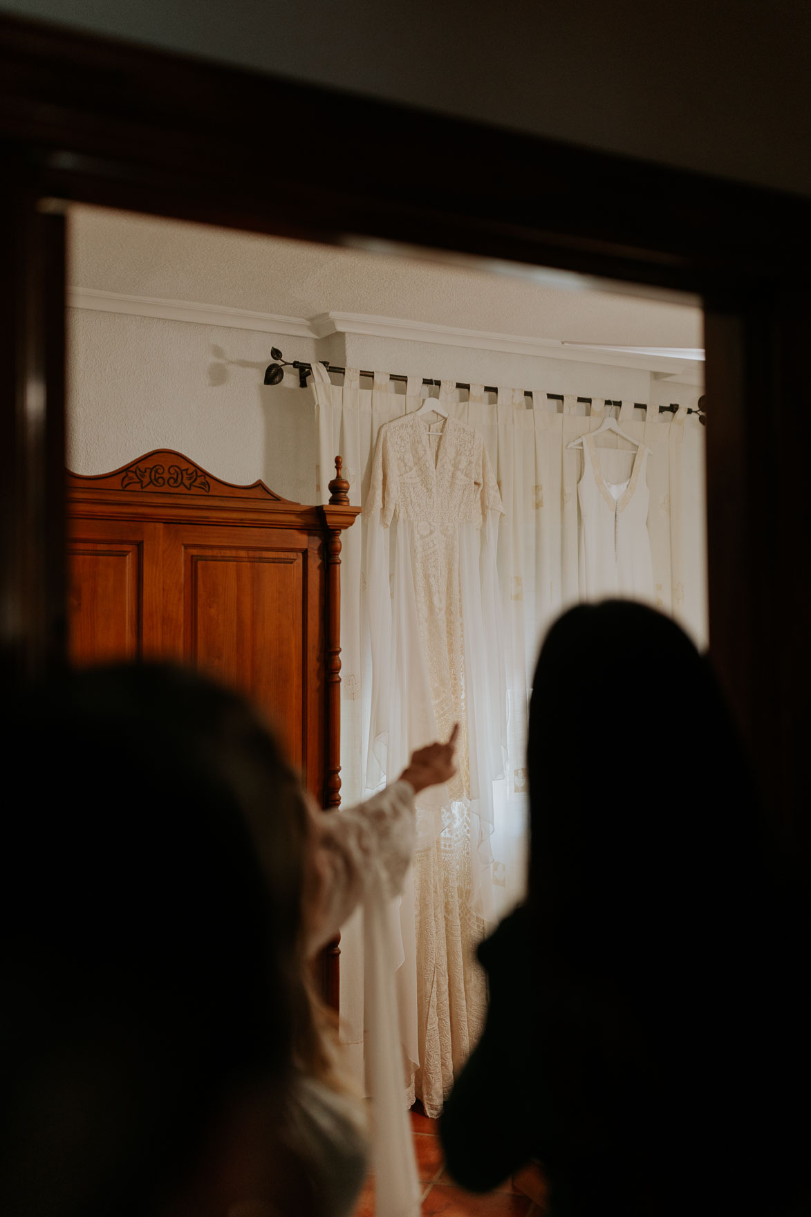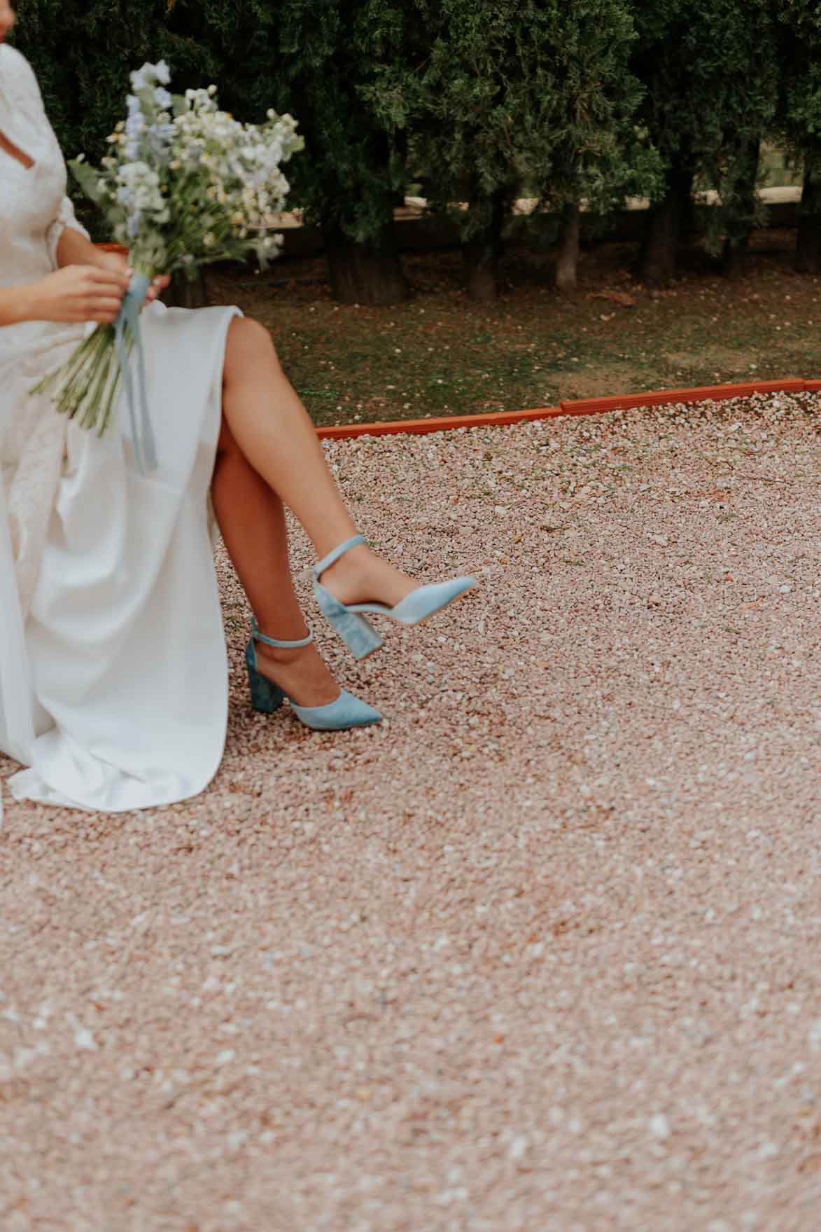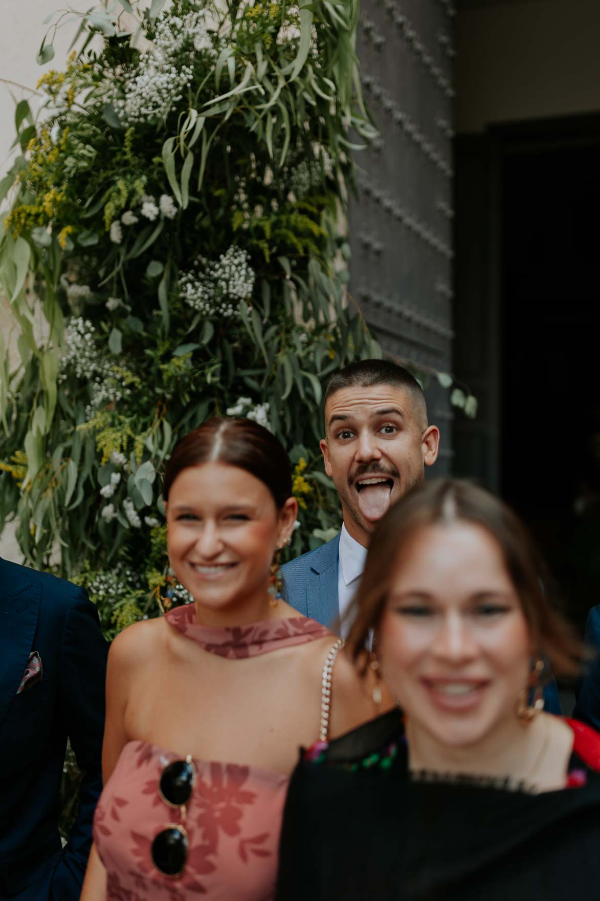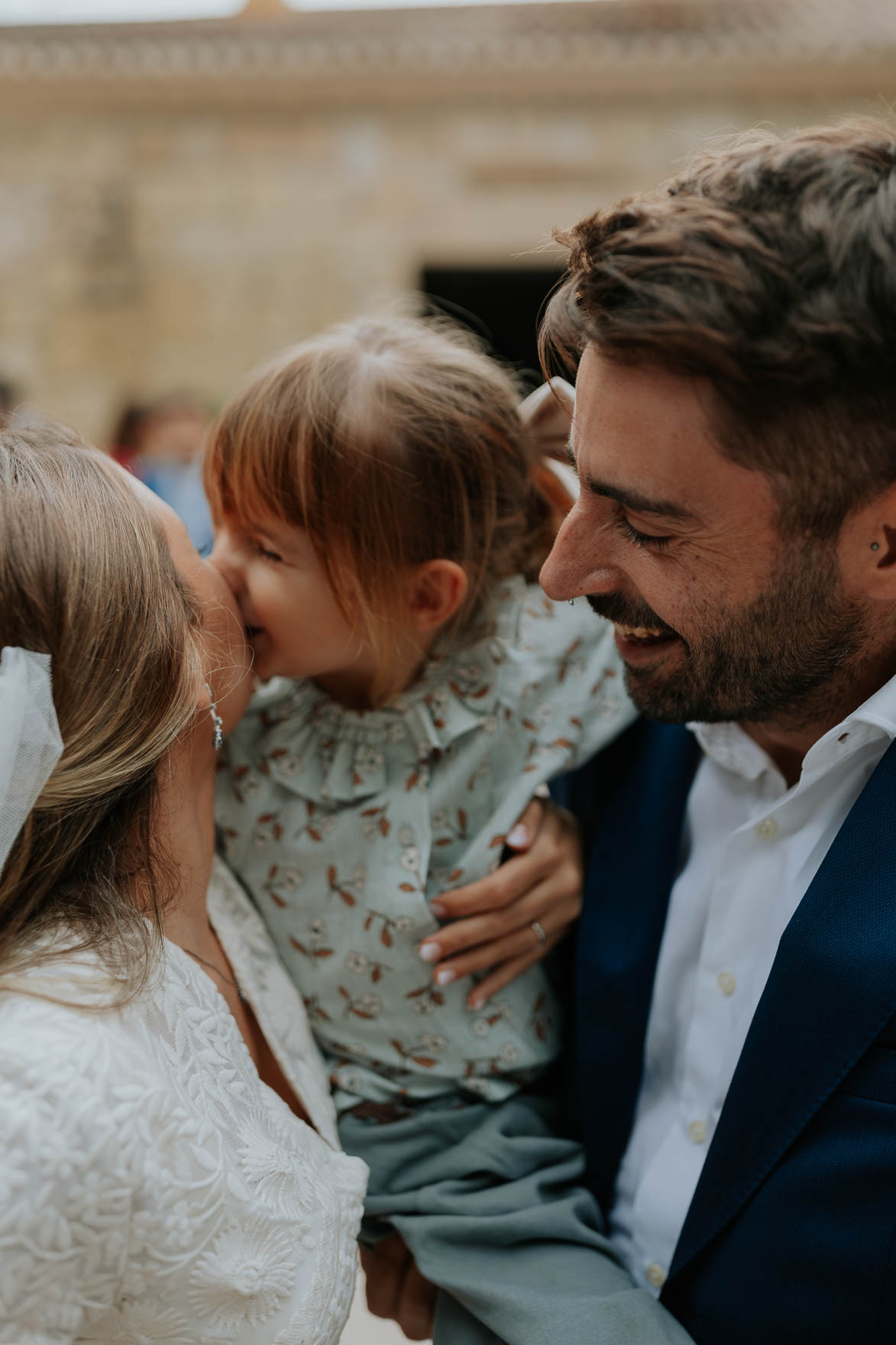 Celia lució un vestido base de crepé y encaje con falda de corte en “A”, sobre el que llevó un sobrevestido de gasa bordada con botones forrados y escote chimenea acabado en pico. Todo hecho a medida por Inma Aniorte, un diseño que reflejaba la delicadeza de la novia. El novio, con traje de Bund, completaba una pareja llena de estilo y complicidad.