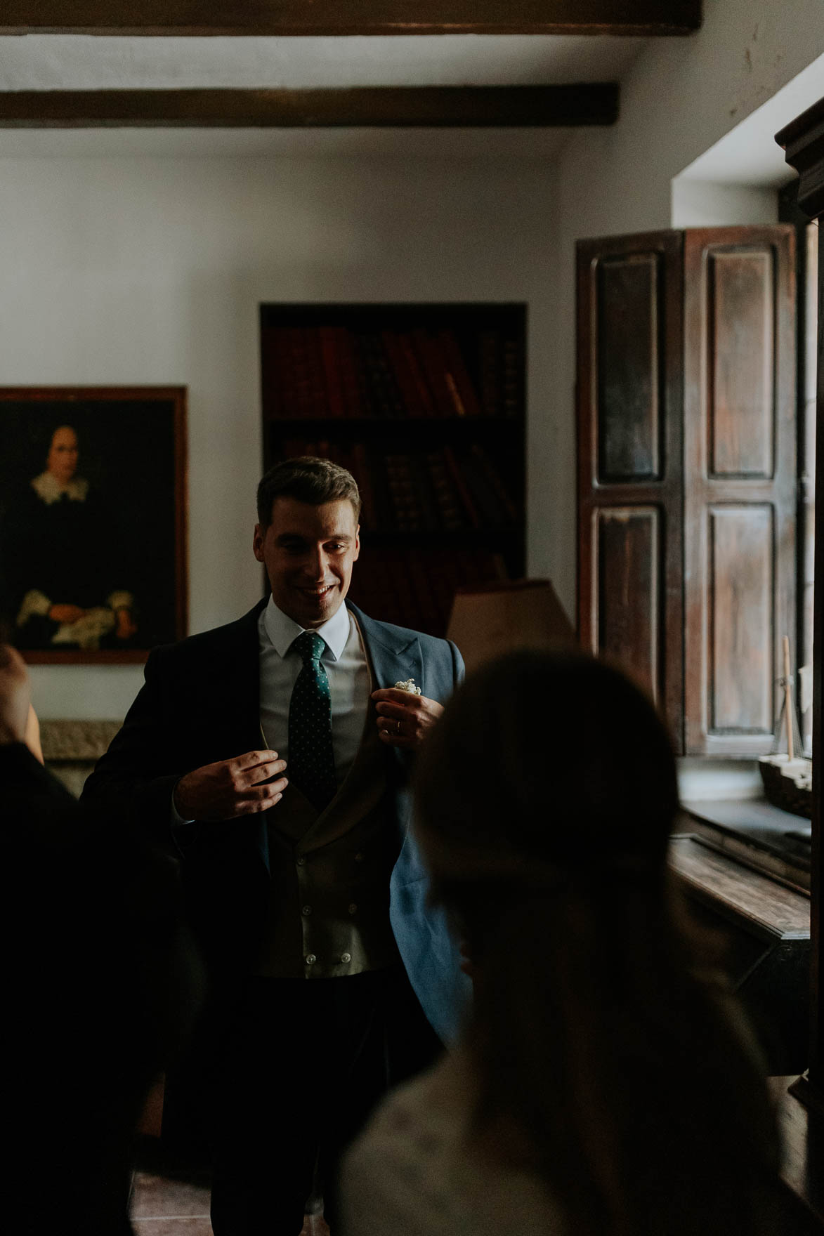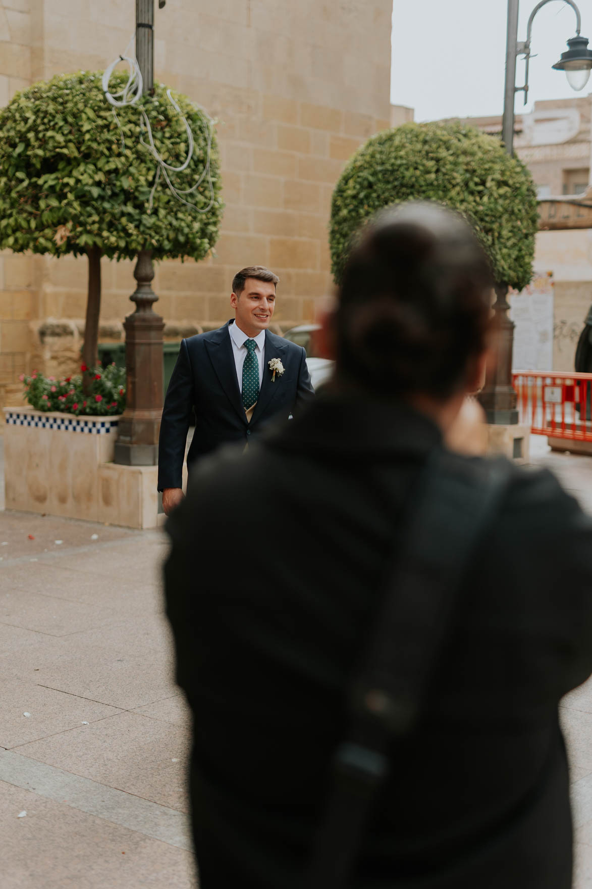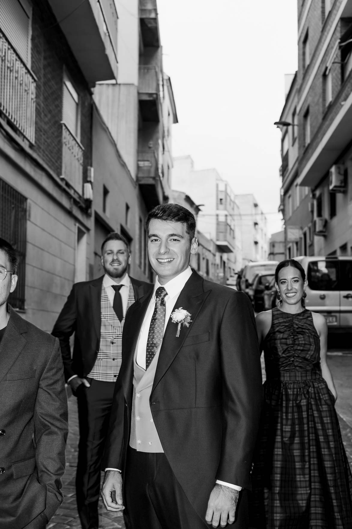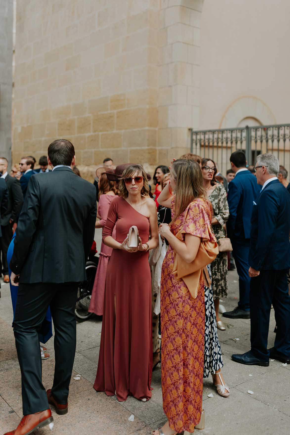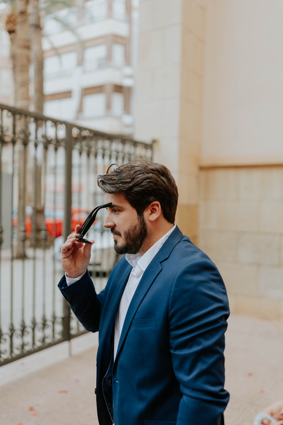 Celia lució un vestido base de crepé y encaje con falda de corte en “A”, sobre el que llevó un sobrevestido de gasa bordada con botones forrados y escote chimenea acabado en pico. Todo hecho a medida por Inma Aniorte, un diseño que reflejaba la delicadeza de la novia. El novio, con traje de Bund, completaba una pareja llena de estilo y complicidad.