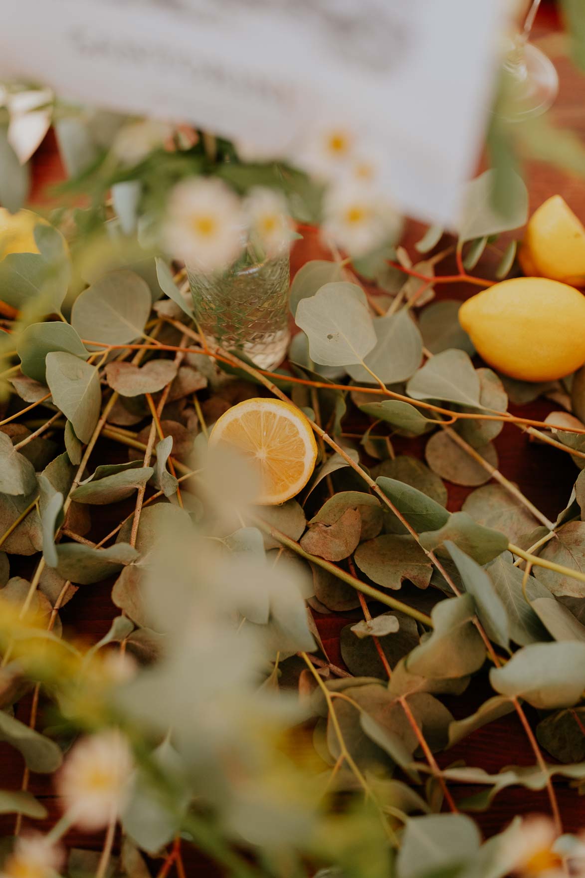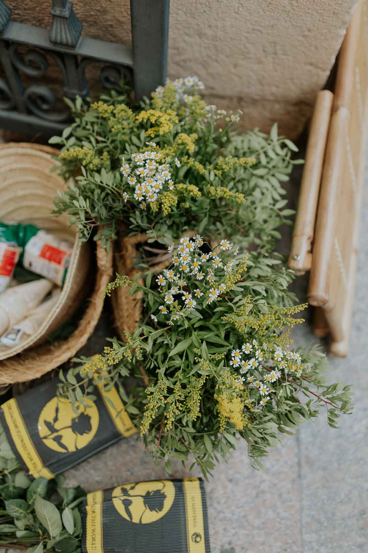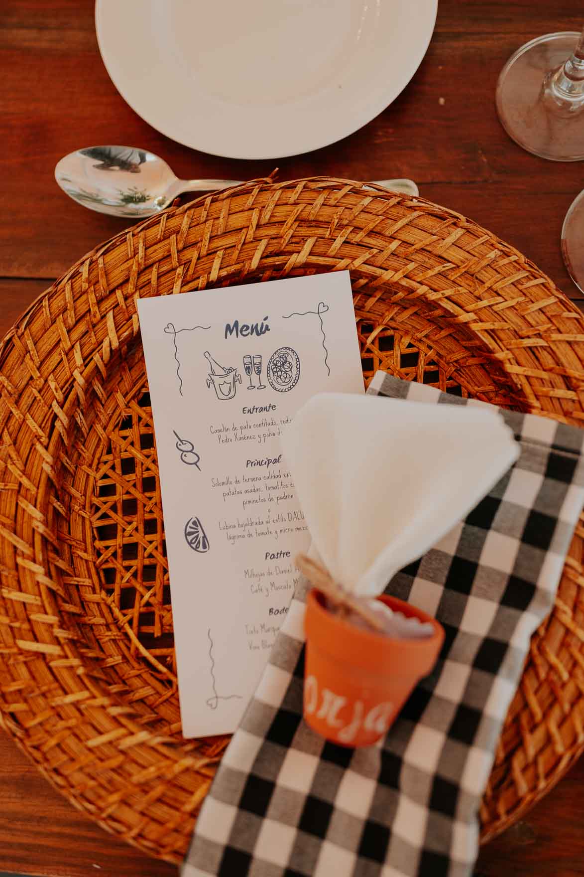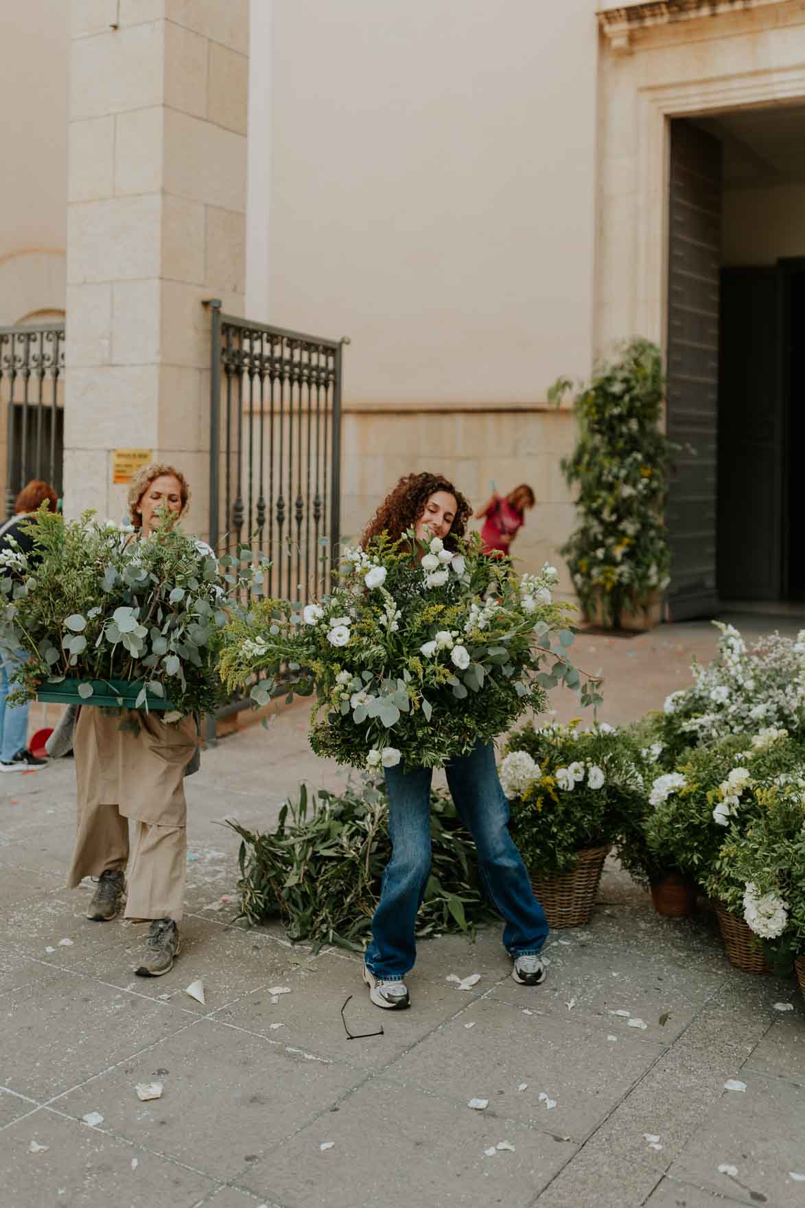 La decoración de la iglesia se basó en una mezcla de hojas de olivo, eucalipto y flores campestres, creando un ambiente natural y armónico. En Finca Torre Bosch, la carpa beduina se vistió con servilletas vichy negras, limones y flores, siguiendo la misma línea, por Las Flores de Aurora.