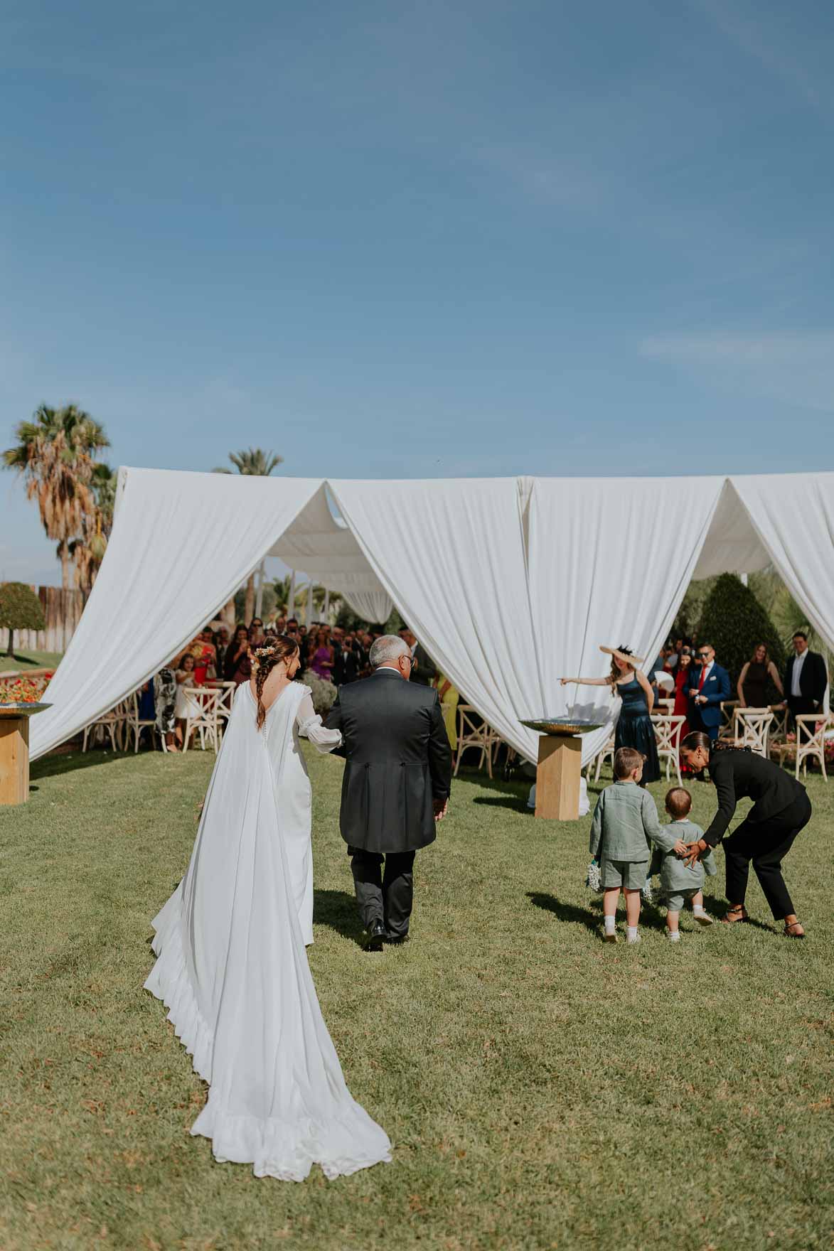 La ceremonia civil fue uno de los momentos más emotivos de la jornada, celebrada en uno de los rincones más encantadores de la Finca BuenaVista. La decoración, realizada por Fernando e Hijos de Murcia, transformó el espacio en un entorno romántico y cálido, donde los novios compartieron sus votos rodeados de amigos y familiares que llegaron de todos los rincones para acompañarlos en su día especial.