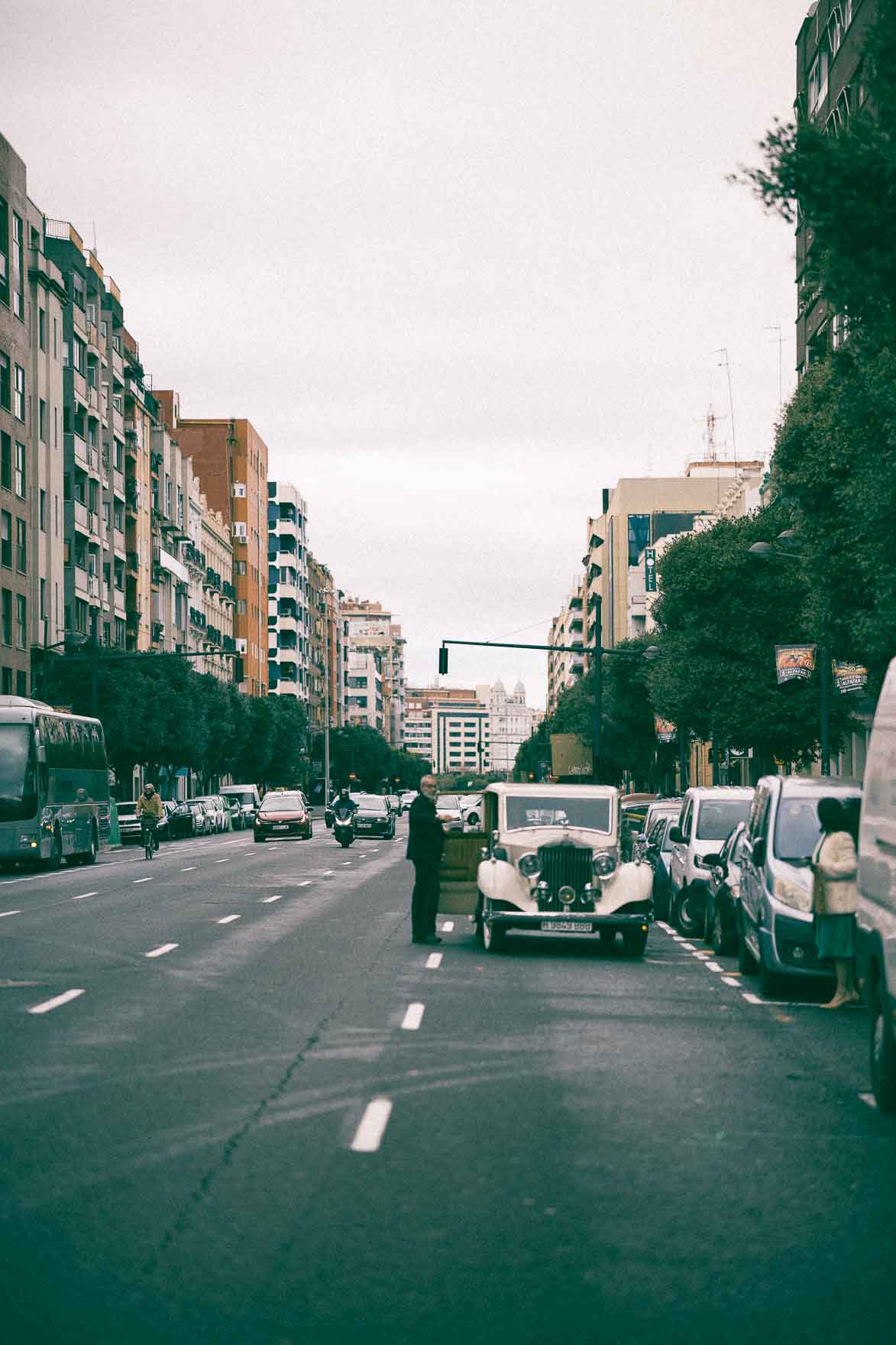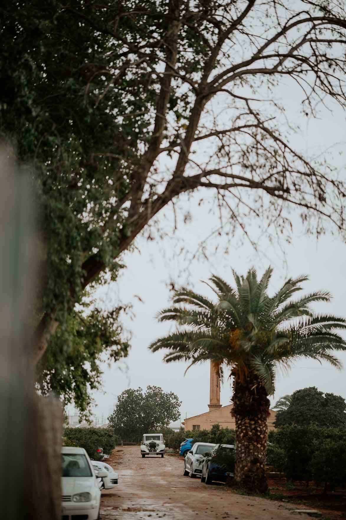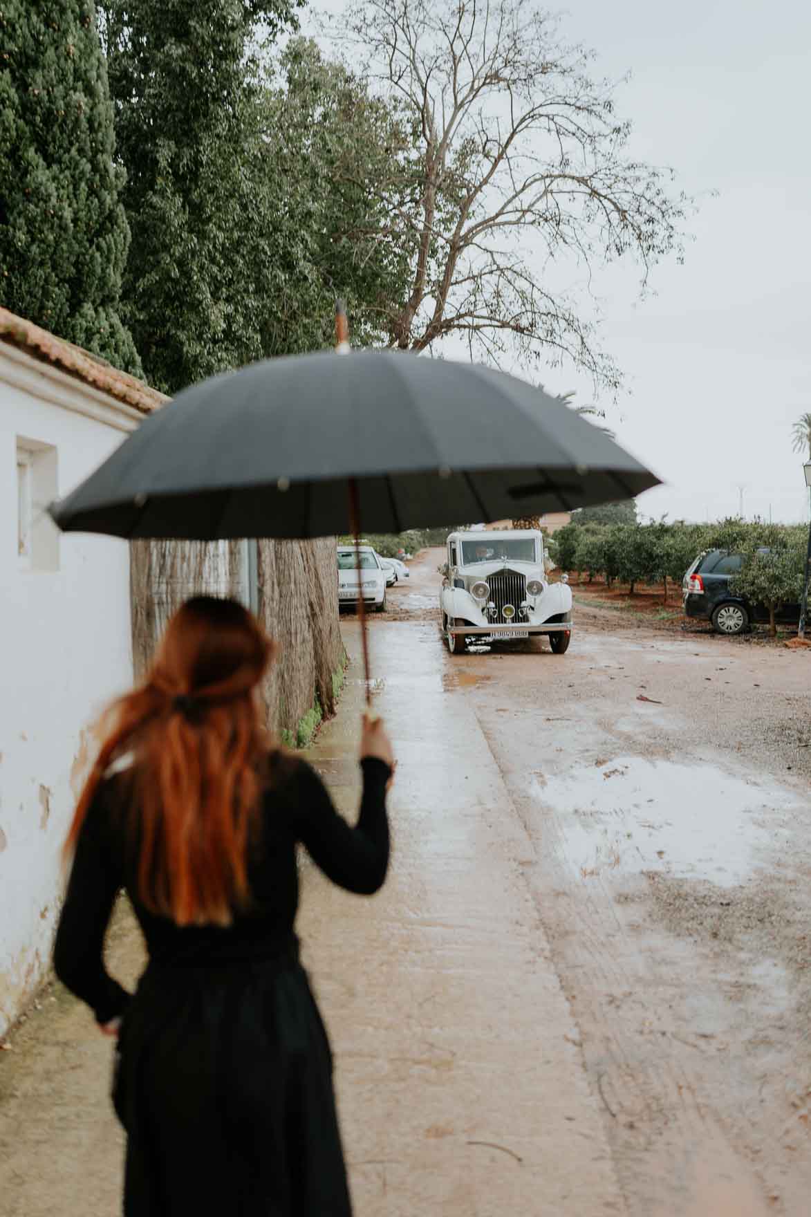 Subimos al Rolls Royce y pusimos rumbo al Huerto San Vicente, una de las fincas con más encanto de Valencia. A pesar de la lluvia, hicimos una sesión de pareja divertida, dinámica y muy natural, jugando con los paraguas y el entorno.