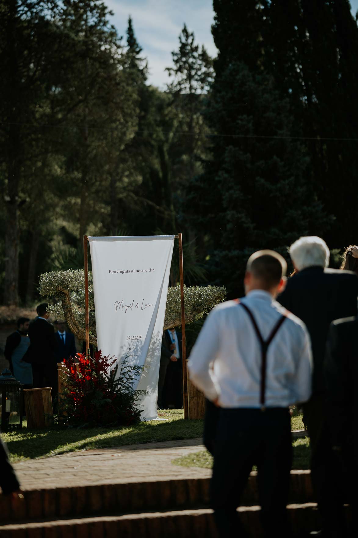 La ceremonia civil se celebró en Ca Pareja, rodeada del entorno natural característico de la finca. Fue un momento muy emotivo, conducido por dos amigos de la pareja que consiguieron que todos nos emocionáramos.