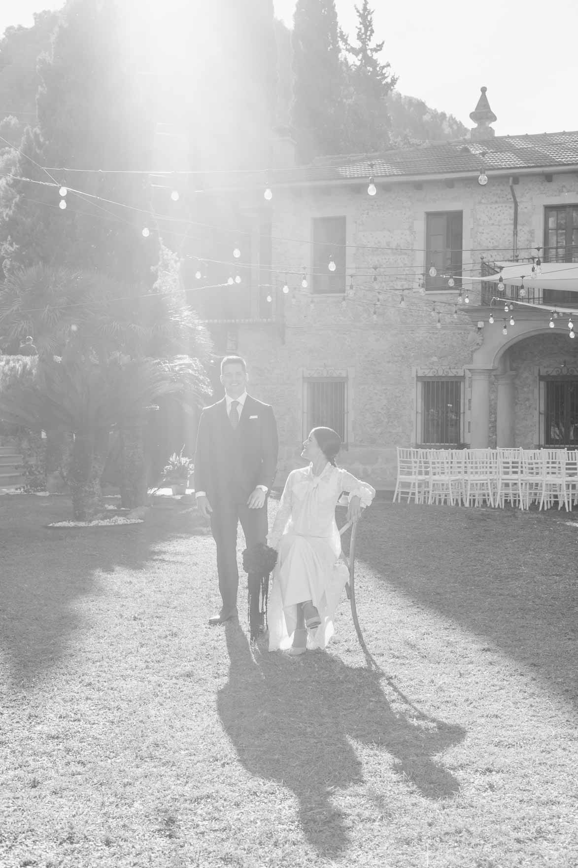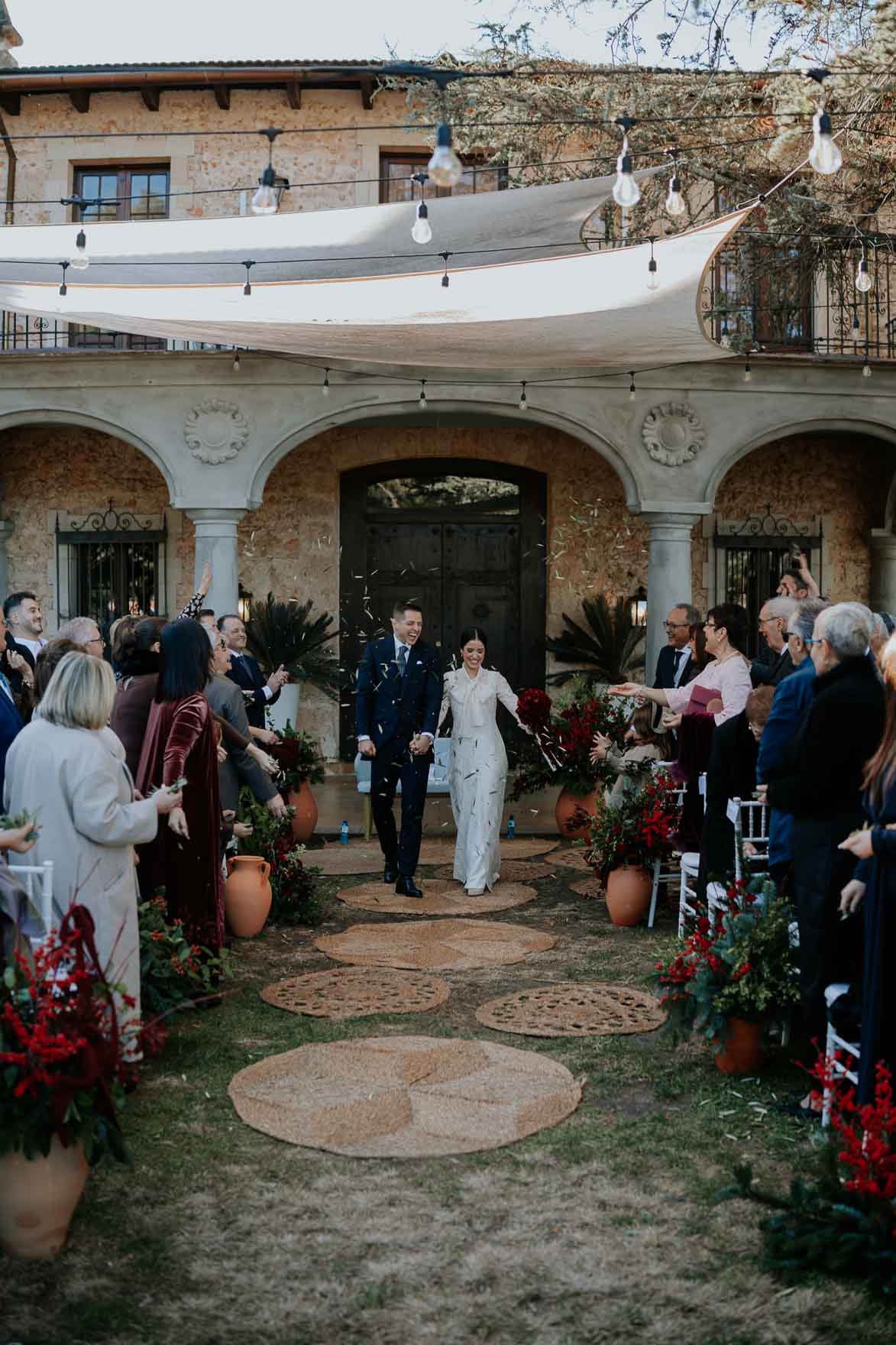 Después de la ceremonia, hicimos una pequeña sesión de pareja: 10 minutos, no más, aprovechando la luz suave de invierno y algunos rincones preciosos de la finca. Ca Pareja tiene ese equilibrio entre naturaleza y arquitectura que hace que todo fluya sin necesidad de grandes poses.