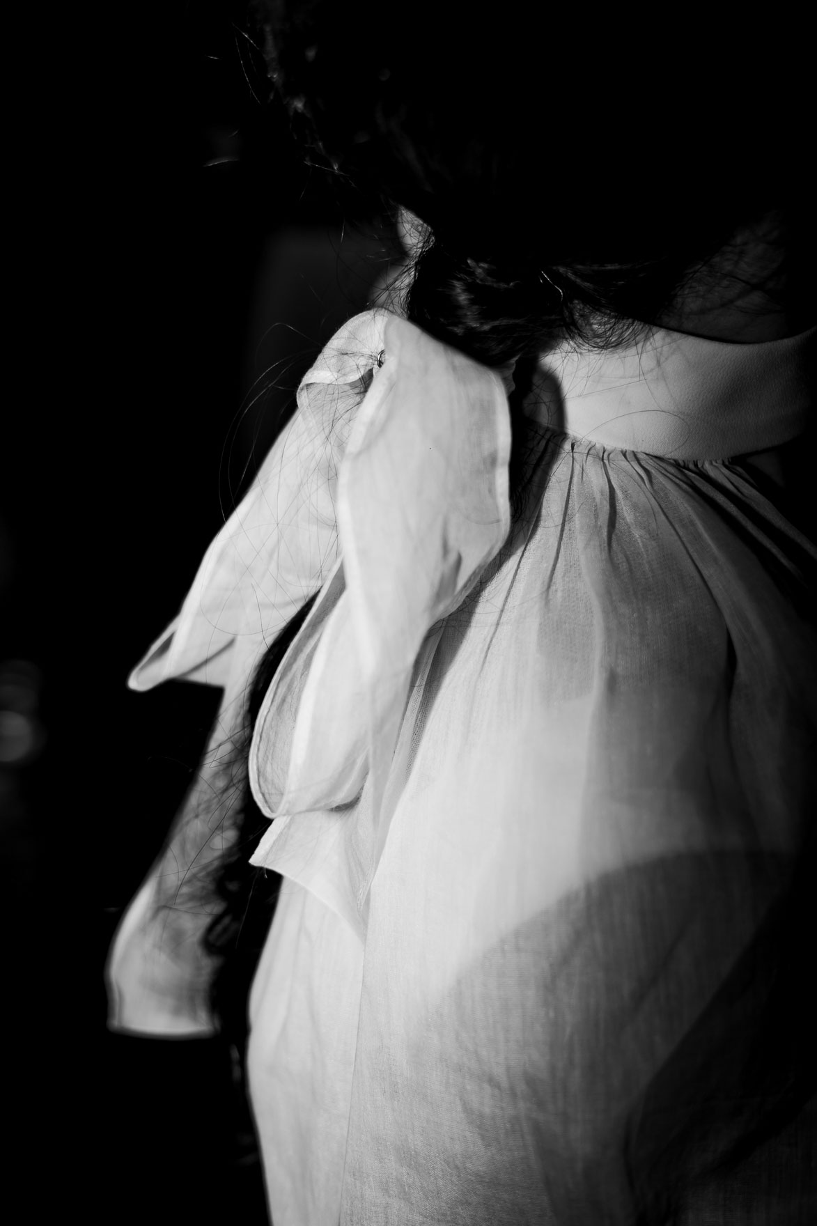 El primer vestido, confeccionado en crepe, era elegante y sencillo, con tirantes anchos y una caída muy limpia. Sobre él llevaba un segundo vestido completo, abotonado por delante y una gran lazada, que dejaba entrever la tela del vestido interior. Un diseño delicado y muy favorecedor.