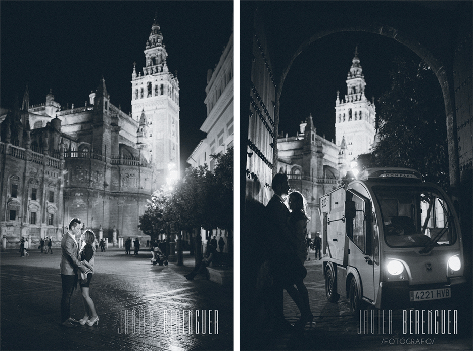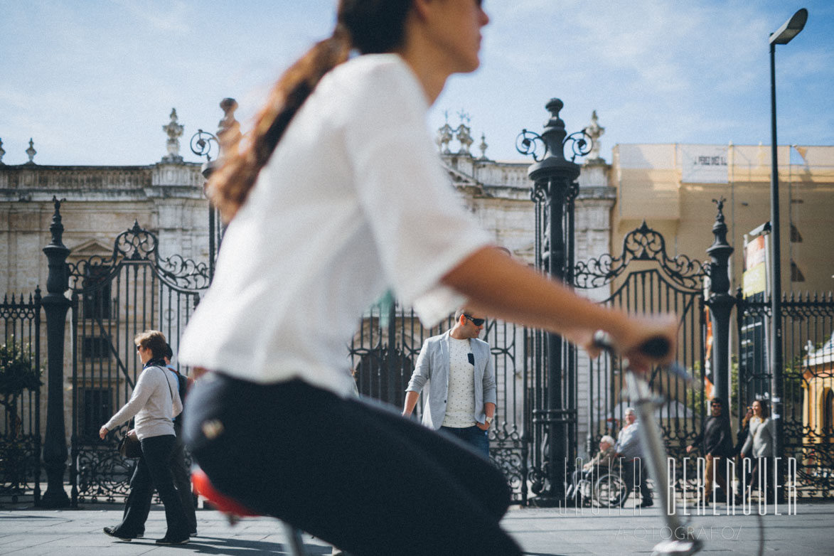 Cuando decidieron casarse tenían claro que de una forma u otra, Sevilla iba a estar presente. Después de unas horas en coche y estar observando a los novios pude conocer sus deseos e inquietudes y lo que realmente esperaban de este reportaje de fotos. Llegamos a Sevilla al Hotel Eme Catedral que era donde nos hospedábamos y en cuanto hicimos el check in nos dispusimos a hacer una pequeña toma de contacto con la ciudad y con los novios para que fuesen cogiendo confianza. Llegó la noche y después de un merecido descanso nos dispusimos a seguir desgranando los rincones de esta ciudad con tanto encanto… calle Sierpes, barrio Santa Cruz y por supuesto el Puente de Triana, mientras la Giralda era testigo de la sesión de fotos que iba realizando.