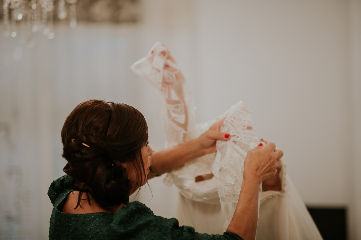 Su vestido fue confeccionado a medida en color marfil con el cuerpo del diseñador Elie Saab, compuesto de organza, seda y tul bordado en cristal, con complementos de perlas cosidas a mano.