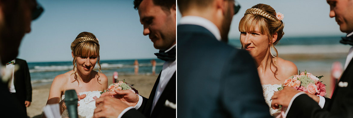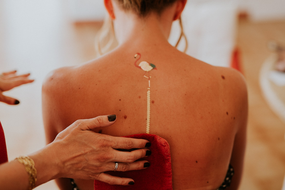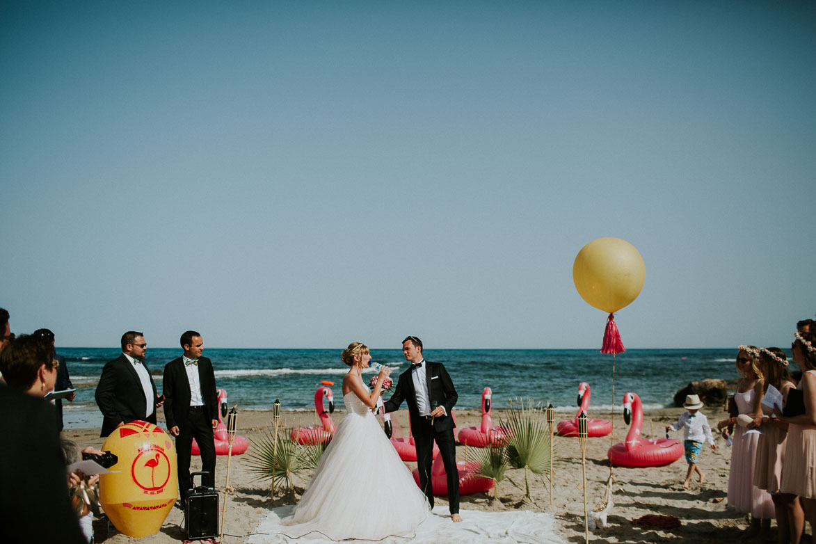 Una boda es un día que nunca se olvida por eso cada detalle es importante para los novios. Casarse en la playa? Eso era el deseo de Sarah y Thibaut, realizar una ceremonia civil en la playa con sus familiares y amigos más cercanos. Junto a esa unión de invitados con los novios, se unían unos flamencos rosas junto a unas antorchas marcando el lugar del «Sí quiero» una decoración poco vista y muy personal para los novios. Después del beso en Cabo Roig de los novios, salieron por el pasillo cogidos de la mano, ella con su super vestido de Rosa Clará con el cuerpo blanco y una preciosa falda de tul rosa, los rayos de sol reflejaban en el en tatuaje de un flamenco que llevaba la novia en la espalda.