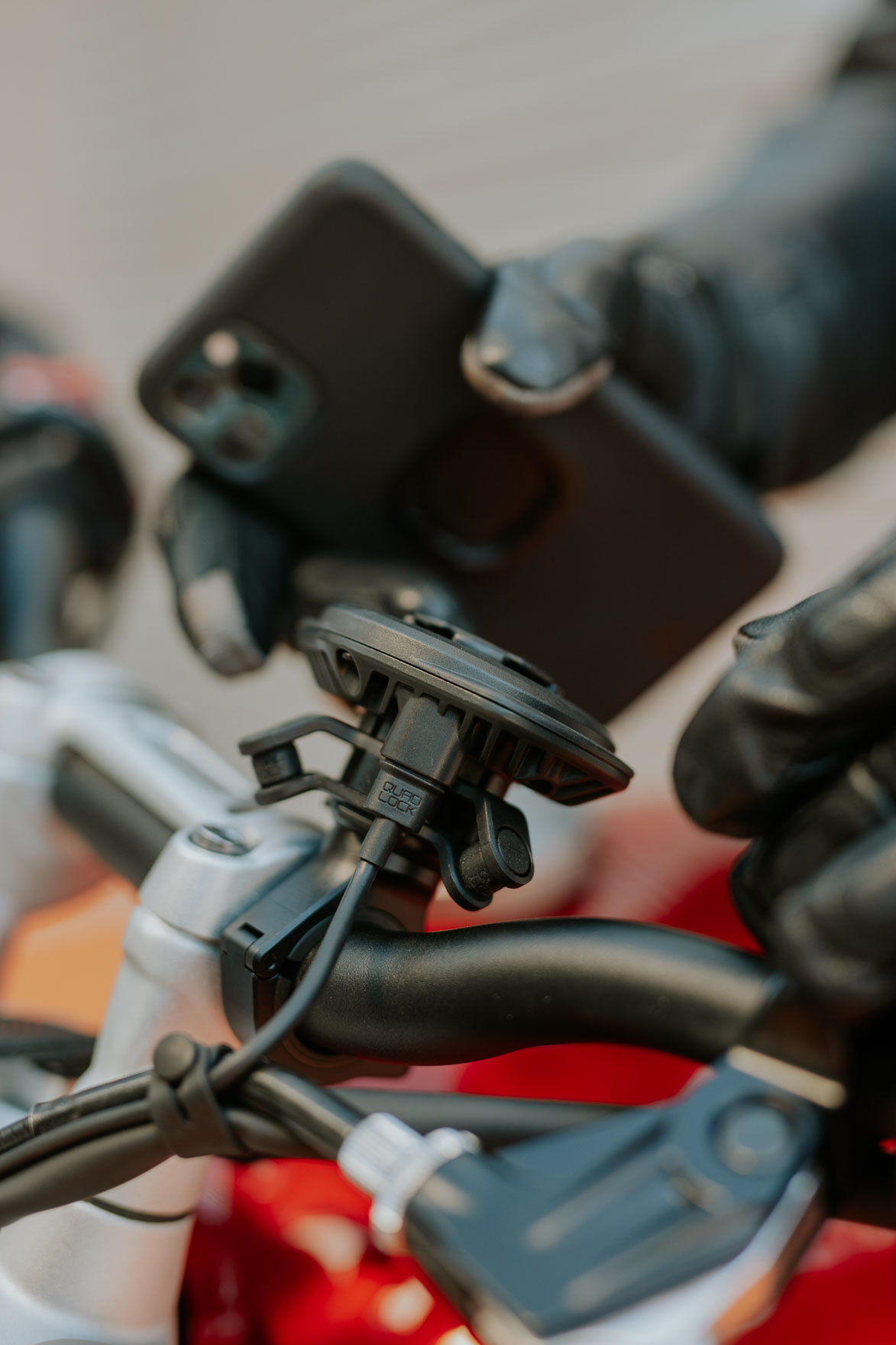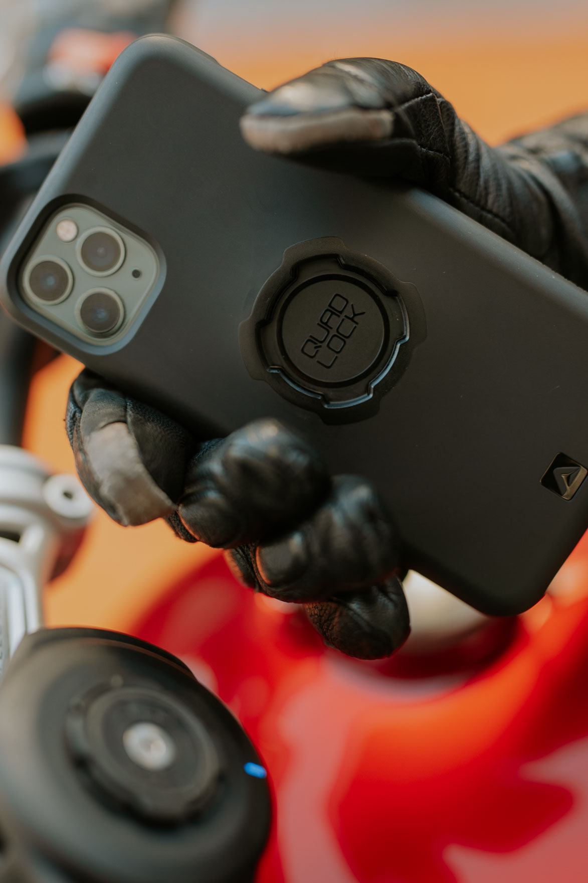 Quad-Lock integra un mecanismo de bloqueo patentado en dos etapas que bloquea de forma segura el teléfono móvil al soporte.